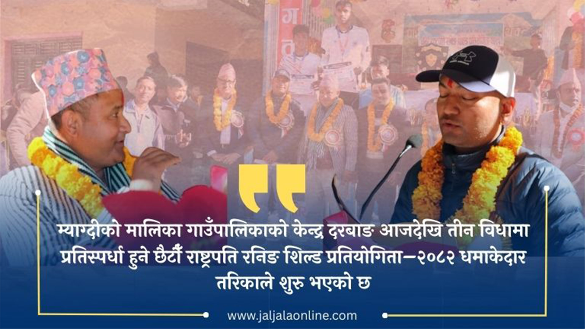 मालिका, मङ्सिर-१६, म्याग्दीको मालिका गाउँपालिकाको केन्द्र दरबाङ आजदेखि तीन विधामा प्रतिस्पर्धा हुने छैटौँ राष्ट्रपति रनिङ शिल्ड प्रतियोगिता–२०८२ धमाकेदार तरिकाले शुरु भएको छ। ‘खेल स्वास्थ्यका लागि, खेलाडी राष्ट्रका लागि’ भन्ने नारासहित सुरु भएको प्रतियोगितामा पालिकाभित्रका १० वटा विद्यालयको सहभागिता रहेको छ।