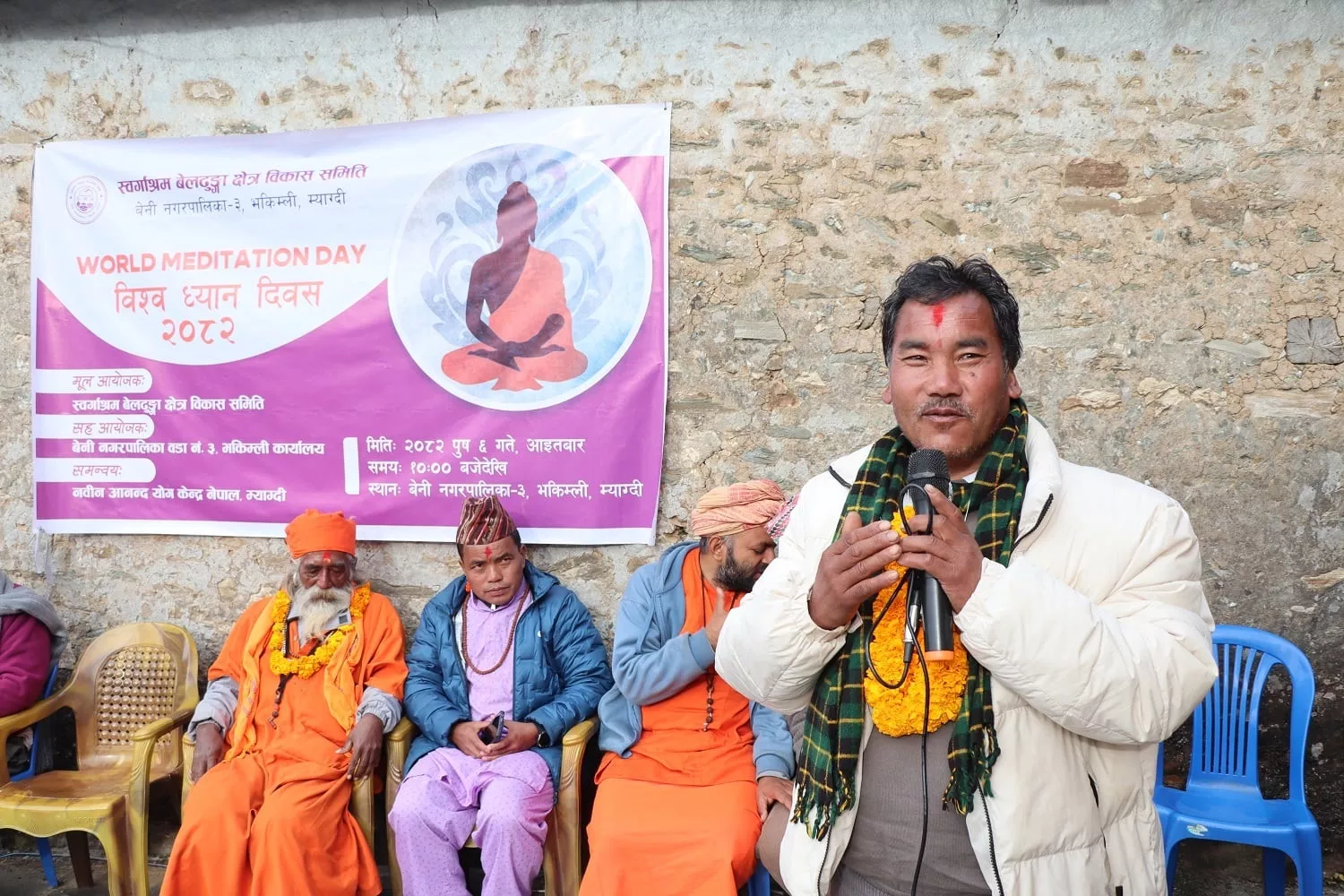 बेनी नगरपालिका वडा नम्बर ३ को कार्यालयको सहयोगमा नविन आनन्द योग केन्द्र नेपाल र स्वर्गाश्रम क्षेत्र विकास समितिको आयोजनामा समुद्री सतहदेखि करिब दुई हजार पाँच सय मिटर उचाइमा रहेको स्वर्गाश्रममा ध्यान दिवस मनाइएको हो।